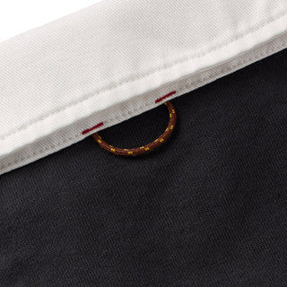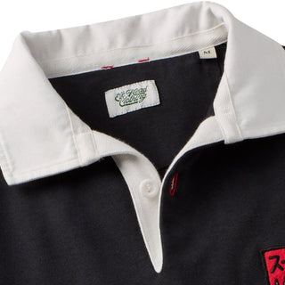 The collar shape, reinforced seam binding, and continuous loop placket all draw from traditional rugby jerseys. Here, those details give the rugby its distinctive stance, structure, and character