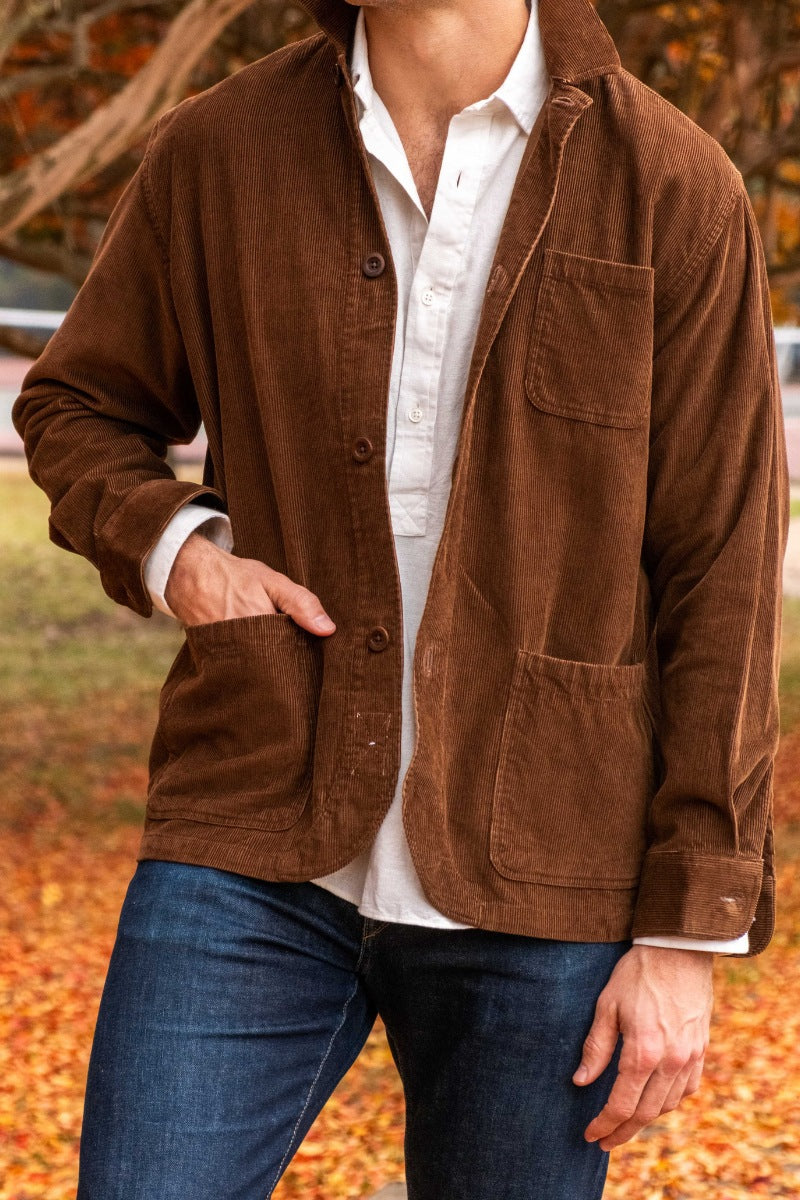 The Brown Corduroy Chore Coat delivers rugged utility with a refined edge, built from richly textured corduroy that balances durability with warmth. Its classic chore-coat construction—complete with functional pockets and sturdy stitching—makes it a reliable everyday layer, while the deep brown tone adds timeless character. Designed for versatility, it pairs effortlessly with workwear staples or more elevated casual pieces, adapting seamlessly across seasons.